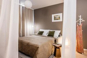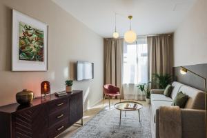 Each apartment features at least one living room, a separate bedroom or two bedrooms, and a bathroom equipped with a shower and hairdryer. The kitchens include stovetops, refrigerators, dishwashers, microwaves, toasters, coffee machines, kettles, and kitchenware for meal preparation. Inside the apartments are flat-screen TVs along with seating and dining areas. Some units provide views of quiet streets while others overlook the city skyline.