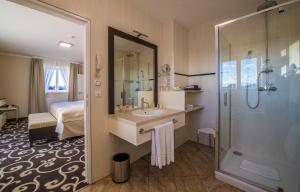 The hotel offers spacious rooms and suites that feature air conditioning, modern furniture, and private bathrooms with bathtubs or walk-in showers. Many rooms include balconies or terraces with views of the city or Old Town. Guests can prepare coffee or tea using in-room machines such as Nespresso coffee makers and electric kettles. Additional room amenities include safety deposit boxes, desks, slippers, bathrobes, radios, fans, carpeted floors, allergy-free options, and free Wi-Fi throughout the building.
