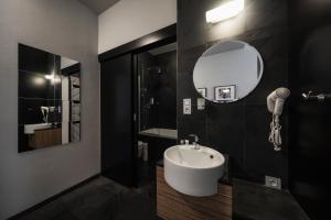 Rooms feature a black-and-white décor accented by red carpets and designer furniture, equipped with soundproof windows, air conditioning, minibars, flat-screen TVs with satellite channels, and tea and coffee making facilities. Bathrooms include grey slate tiles or marble floors with either a bathtub or shower and come stocked with free toiletries such as shampoo.