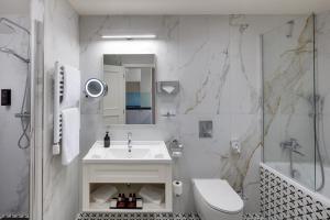 The hotel's rooms and suites blend traditional English style with modern appliances. Each accommodation includes a flat-screen smart TV, private marble bathroom with bathtub and/or shower, hairdryer, individually controlled air conditioning, and a Nespresso coffee machine. Some units feature kitchenettes equipped with microwaves. Higher categories provide additional amenities such as bidets, bathrobes, slippers, and heated bathroom floors. All rooms are non-smoking, certain rooms allow pets upon request.