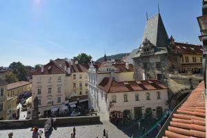 The accommodation includes double rooms facing Mostecka Tower and Drazicke Square, most equipped with king-size beds. One apartment showcases an original painted wooden Renaissance ceiling. Rooms vary between studios, apartments, and suites that provide air conditioning, flat-screen TVs with cable channels, minibars, wardrobes, seating areas, and kitchen facilities including refrigerators, microwaves where specified, and kitchenware. Bathrooms come with showers or baths alongside complimentary toiletries, some have hairdryers. Additional room amenities include washing machines in select studios or apartments and travel cots when requested.