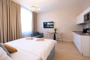 The recently renovated apartment includes a living room, a separate bedroom with two beds or a studio option with one bed, and a private bathroom equipped with a shower, hairdryer, slippers, and complimentary toiletries. The well-fitted kitchen provides essential appliances including a stovetop, refrigerator, microwave, toaster, coffee machine and kettle. A seating area complements the flat-screen TV featuring streaming services.