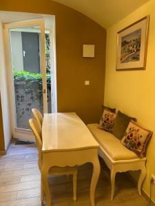 The apartment includes a fully equipped kitchen with cooking facilities and storage space, alongside a washing machine for added convenience. The living area features a seating space with a flat-screen TV, complemented by free Wi-Fi throughout the unit. Guests can enjoy views of the garden from inside.