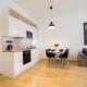 Each apartment includes a living room or studio layout with one bedroom or a combined sleeping area, soundproof walls, and hardwood or parquet floors. Guests can prepare meals in well-equipped kitchens that include stovetops, refrigerators, kitchenware, coffee machines, kettles, and dishwashers. Seating areas feature flat-screen TVs while bathrooms provide free toiletries such as shampoo along with bathtubs or showers and hairdryers. Some apartments offer balconies overlooking the inner courtyard or city views.