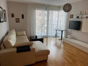 The spacious apartment includes one bedroom with two beds and soundproofed walls for added privacy. Guests can prepare meals in the kitchen equipped with a stovetop, refrigerator, dishwasher, oven, microwave, toaster, and basic kitchenware including wine glasses. The living area features a sofa and a flat-screen TV while laundry needs are met with an on-site washing machine and tumble dryer. Towels and bed linen are provided.