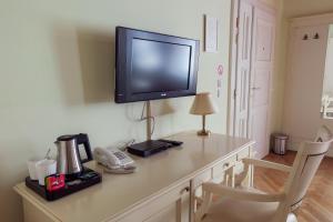 The bright rooms feature wooden or parquet floors, seating areas, flat-screen cable TVs, and some include painted ceilings. Each room provides soundproofing for quiet comfort alongside amenities such as a private entrance, wardrobe or closet, heating system, fan, hypoallergenic pillows, and safes for valuables. Bathrooms contain both walk-in showers and bathtubs with bidets.
