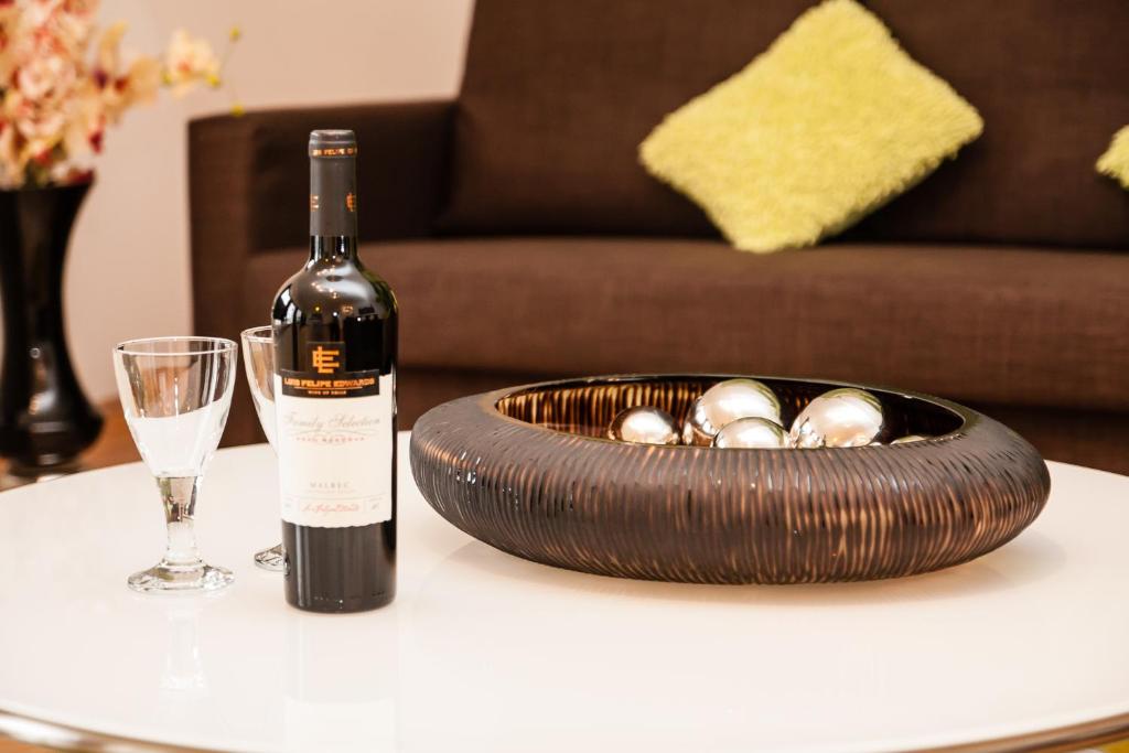 Each apartment includes multiple bedrooms and bathrooms with showers or bathtubs and free toiletries. Living areas have flat-screen TVs and seating arrangements, while dining spaces accompany kitchenettes designed for self-catering. Some units feature terraces with outdoor dining tables offering views of nearby landmarks.